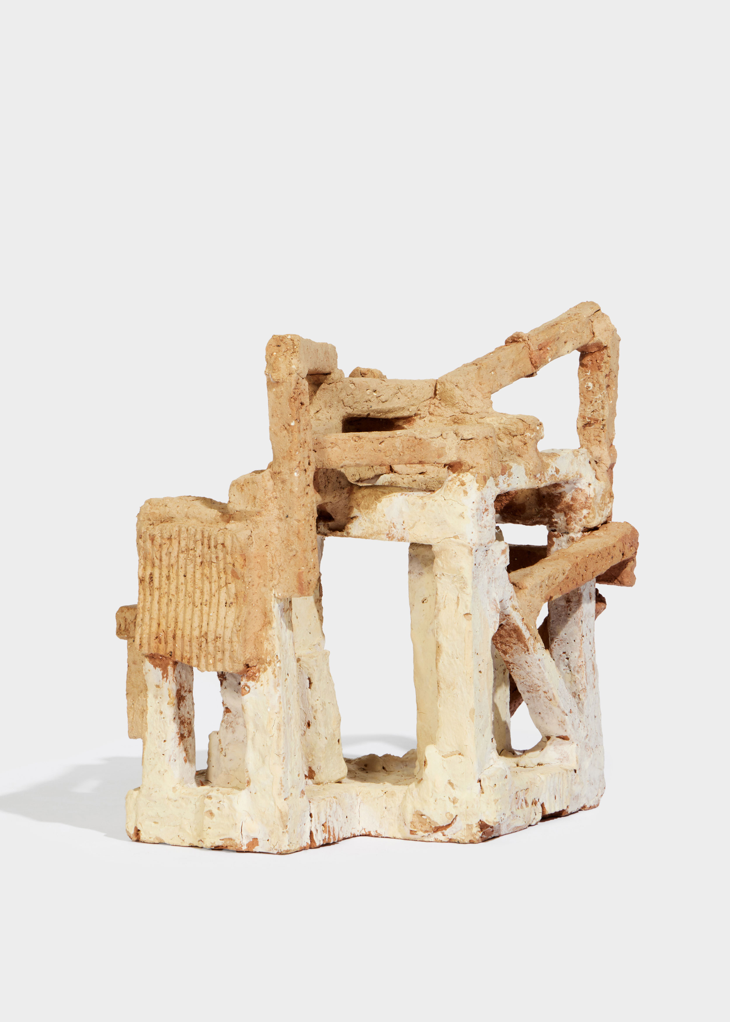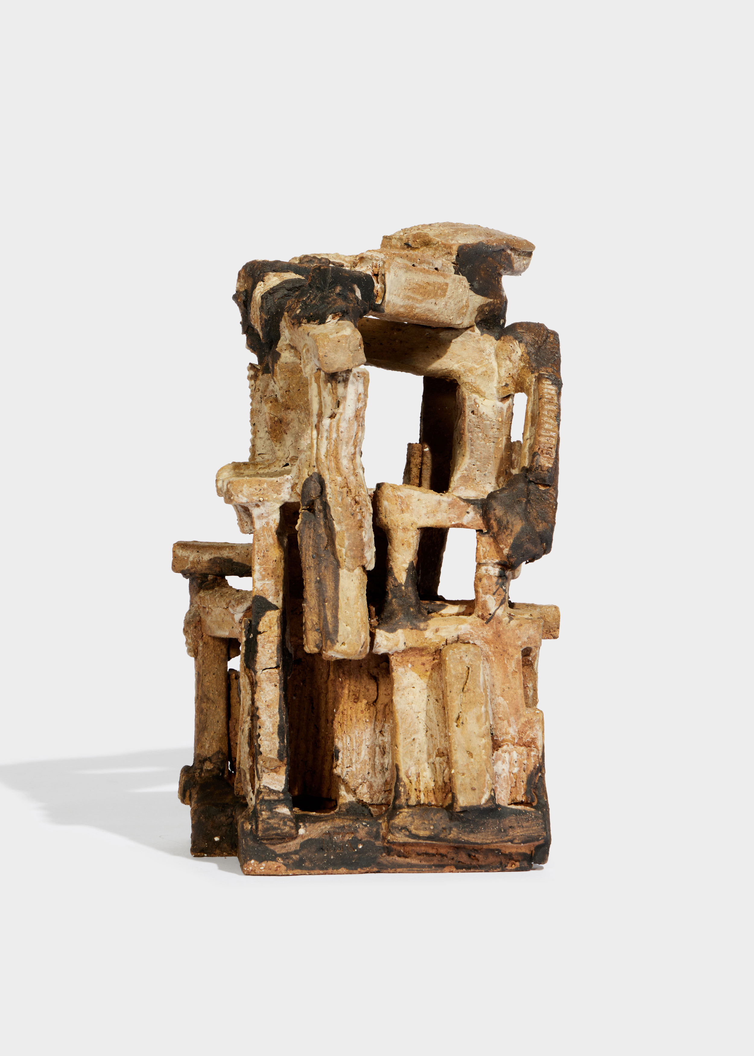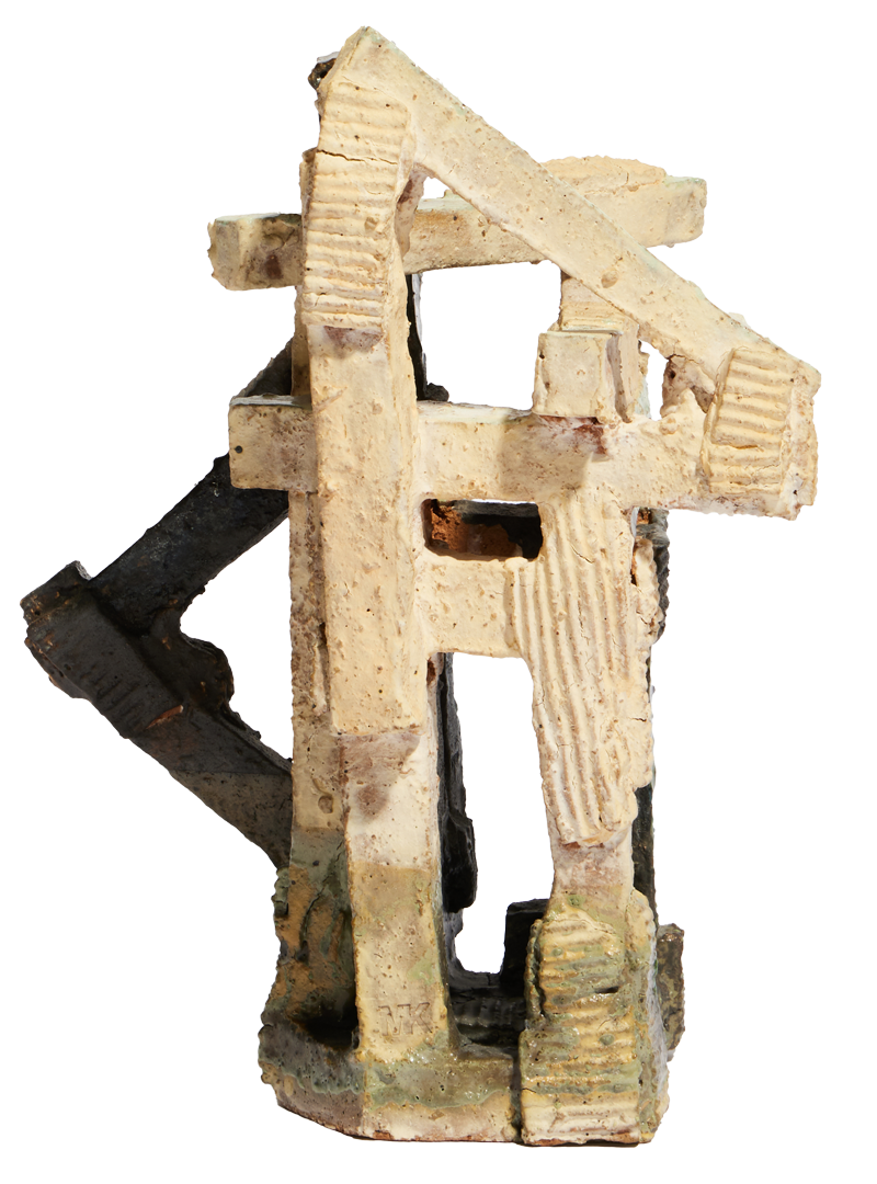 and instinct. His sculptures, forged from raw clay, reflect the tension